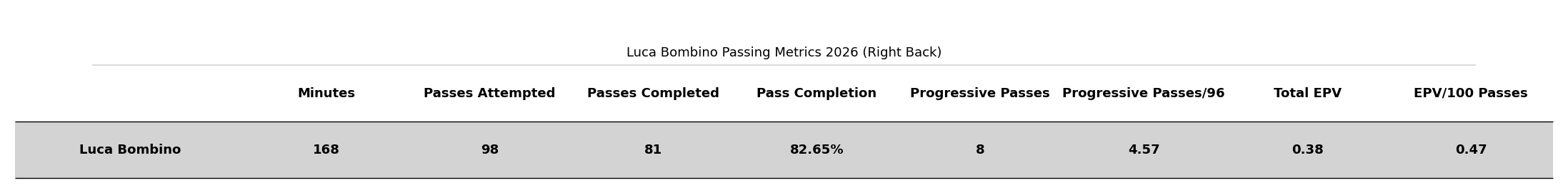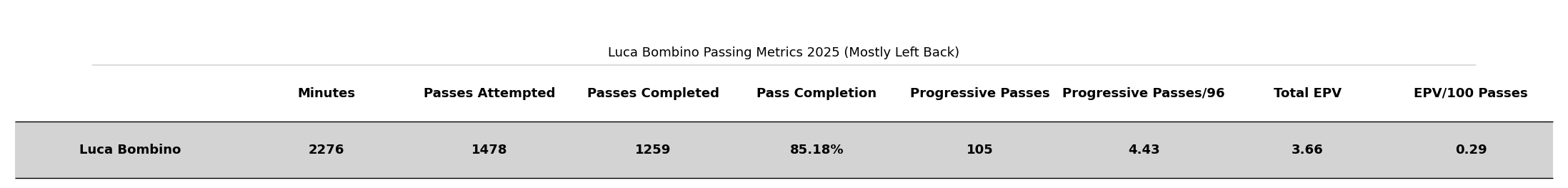 Im going passing first here. I’ve laid out Bombino’s performance across a few key metrics to see where he’s at.