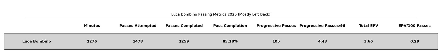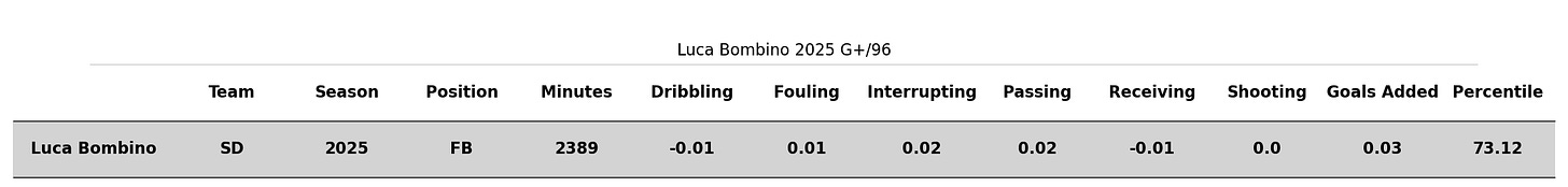 While Bombino isn’t an elite MLS fullback yet, his data is definitely promising. I like to start off with a summary metric, and until I build my own I’m going to stick with American Soccer Analysis’ great Goals Added (G+) figure. Bombino’s goals added vs average per 96 minutes for the 2025 season was 0.03, meaning that compared to an average MLS player, he added 3% of a goal for every 96 minutes (approximately one complete game with added time) he played. This is awesome: he looks like a slightly above-average player. Since it’s a little harder for fullbacks to add value than players at some other positions, Bombino was actually a 73rd percentile G+ player among fullbacks with over 1000 minutes last season. This is awesome for an 18/19 year-old.