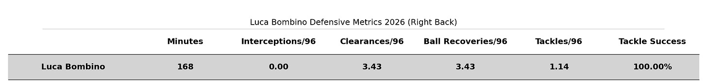 This season, on the right, things look worse for Bombino. By G+, he’s been a well below-average fullback, sitting in the 36th percentile of qualified fullbacks with -0.08 goals added/90. In other words, an active negative.