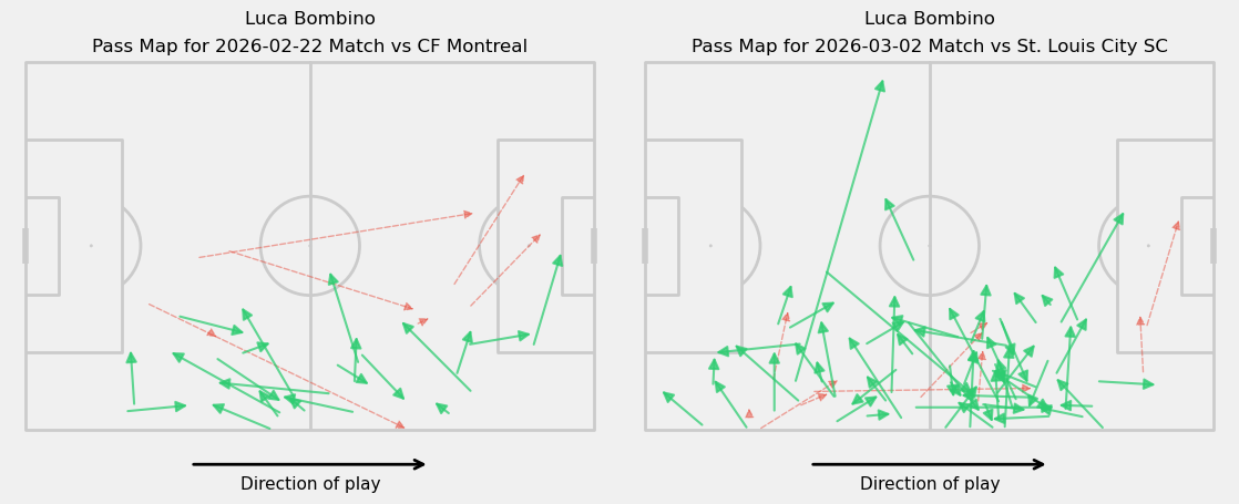 Bombino hasn’t just started at right-back, though. I think he’s actually looked okay at the position, especially in his second match of the year against St. Louis City. Let’s dive into the numbers to see if my eye has been correct, and where the differences have been between his play at left back and on the right.