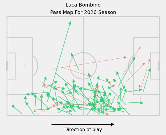 Though, once again, sample size is the elephant in the room, there’s a bit of a change in Bombino’s passing profile. He’s progressing the ball about the same, but his completion has gone down a few ticks, and his expected possession value (EPV) per 100 passes has gone up a good amount.2 This is a simple grid based EPV model, so it is very likely to be skewed by the sample, but the decrease in completion and increase in EPV might indicate a slightly more aggressive pass diet from Bombino this season. Let’s look into that more.