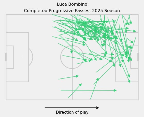 First, those straight passes down the line are there, and some really nice central progressive passes are either from Bombino drifting into the center or some midfield minutes that I don’t know about. This lines up with my preconceptions, which were that players are significantly hampered in progression by playing on the wrong side. Since these are just progressive passes, though, we are missing a lot of classic SDFC recycling that looks similar to his play on the right.